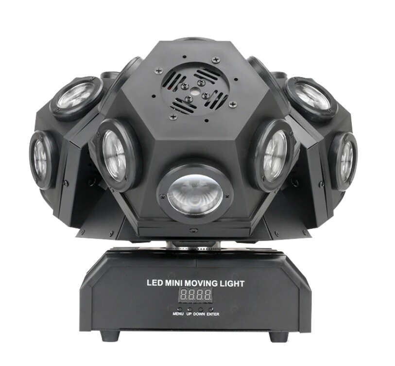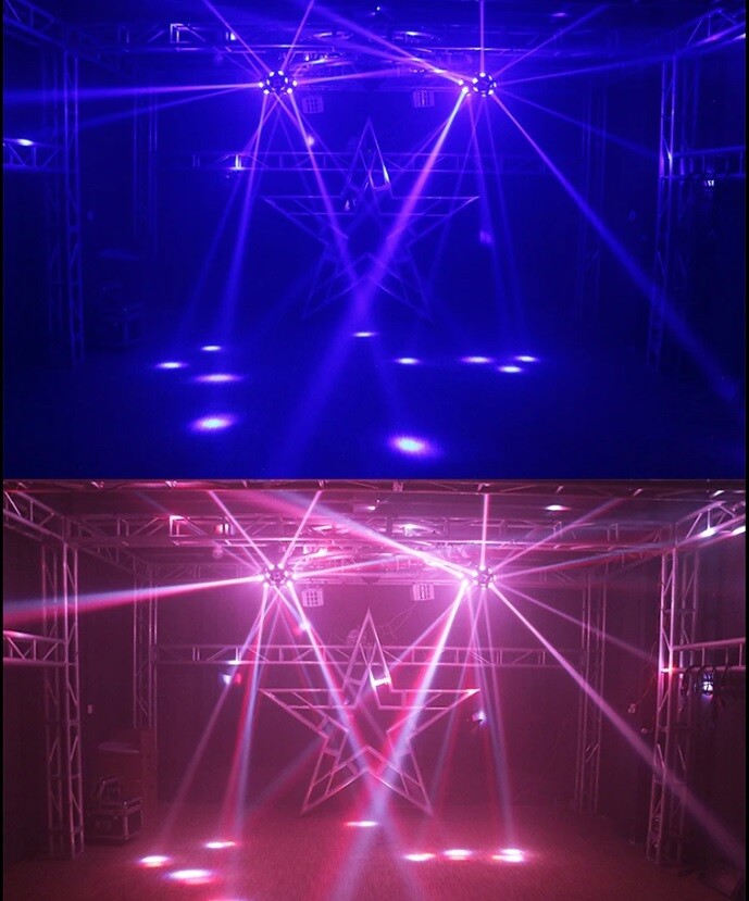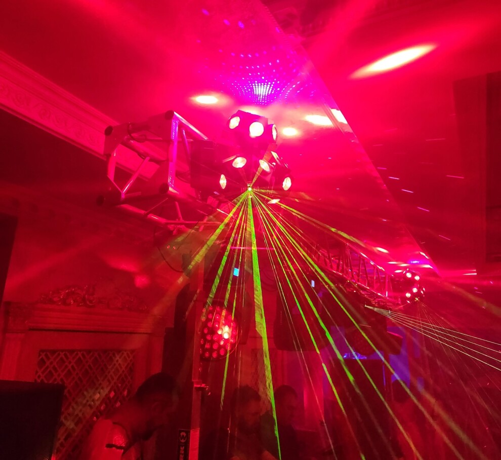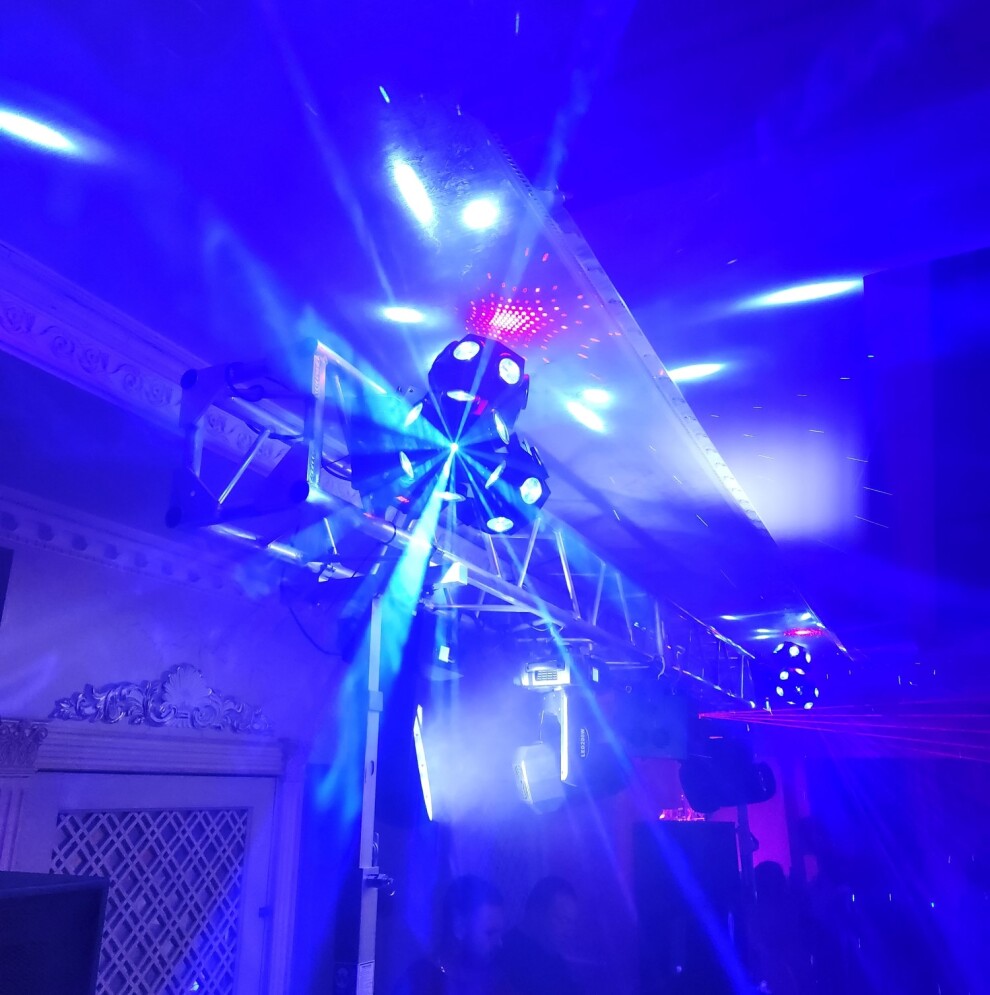 Крутой прибор, вращаясь заливает все пространство динамичным светом,